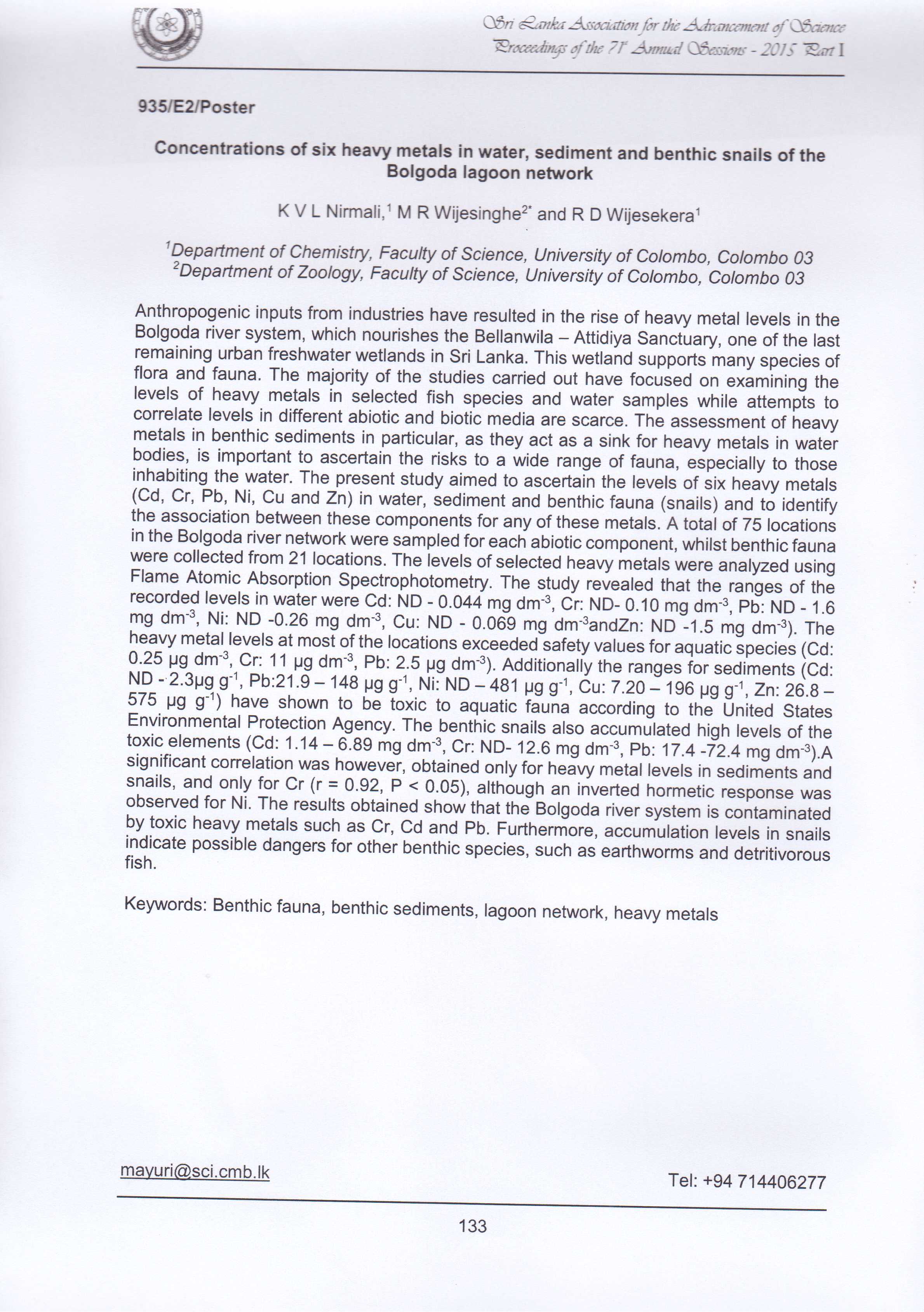 Nirmali, K.V.L. Wijesinghe, M.R. and Wijesekara, R.D. (2015). Concentrations of six heavy metals in water, sediment and benthic snails of the Bolgoda lagoon ...